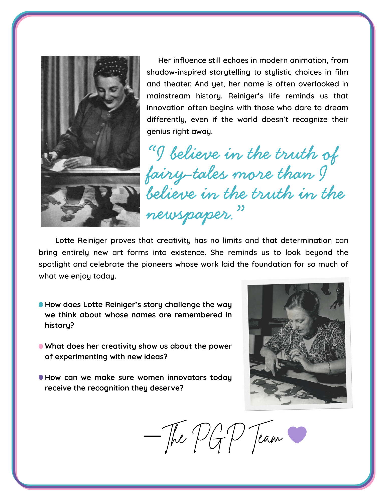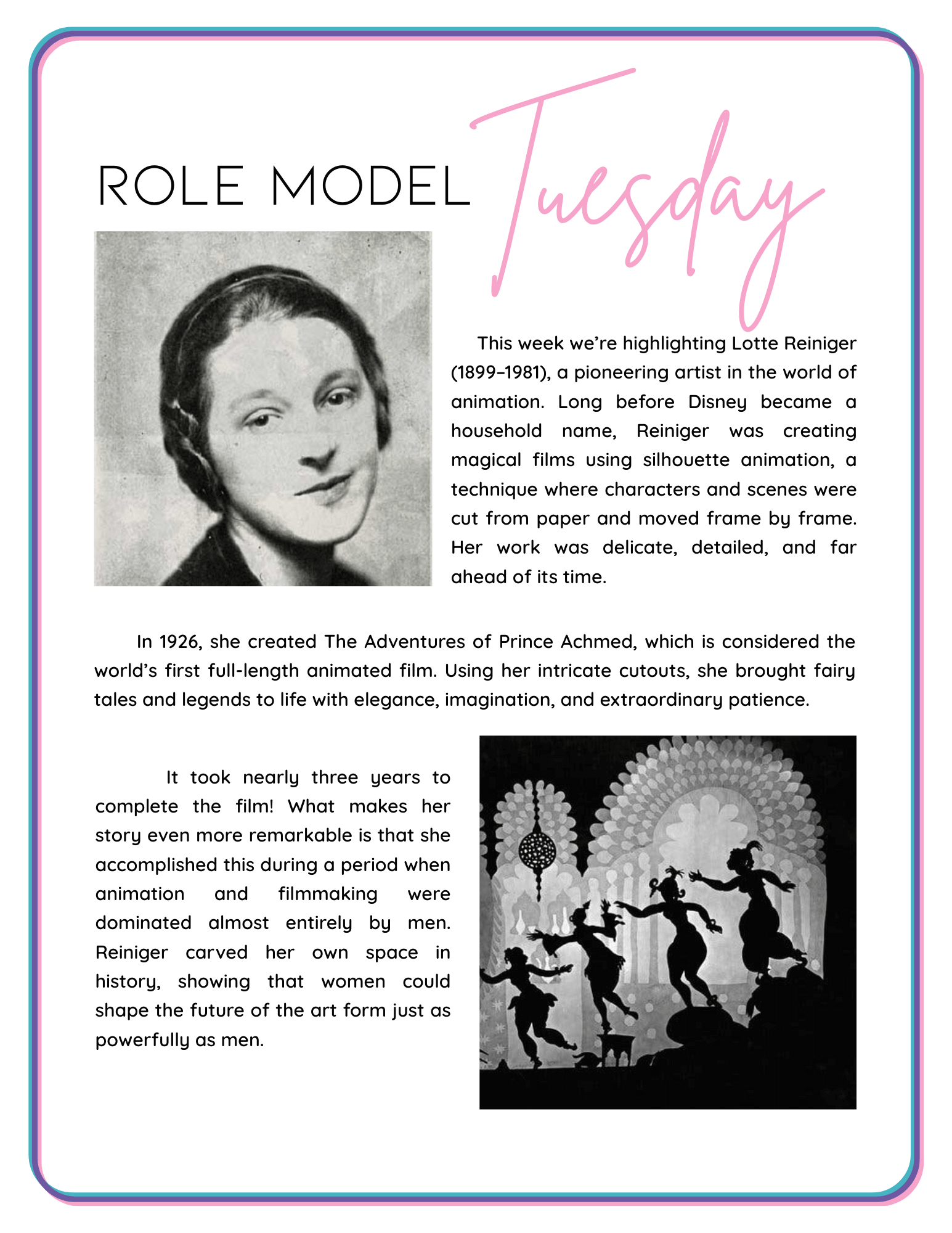 This week’s Role Model Monday features Lotte Reiniger, the brilliant animator who created the world’s first full-length animated film using paper cutout silhouettes. Her groundbreaking artistry paved the way for the animation industry as we know it today, yet her name is too often left out of history. Reiniger’s story reminds us that creativity, persistence, and innovation can change the world, even if recognition comes late.