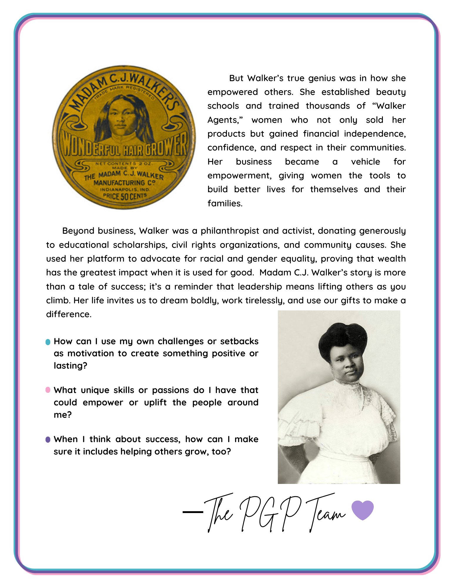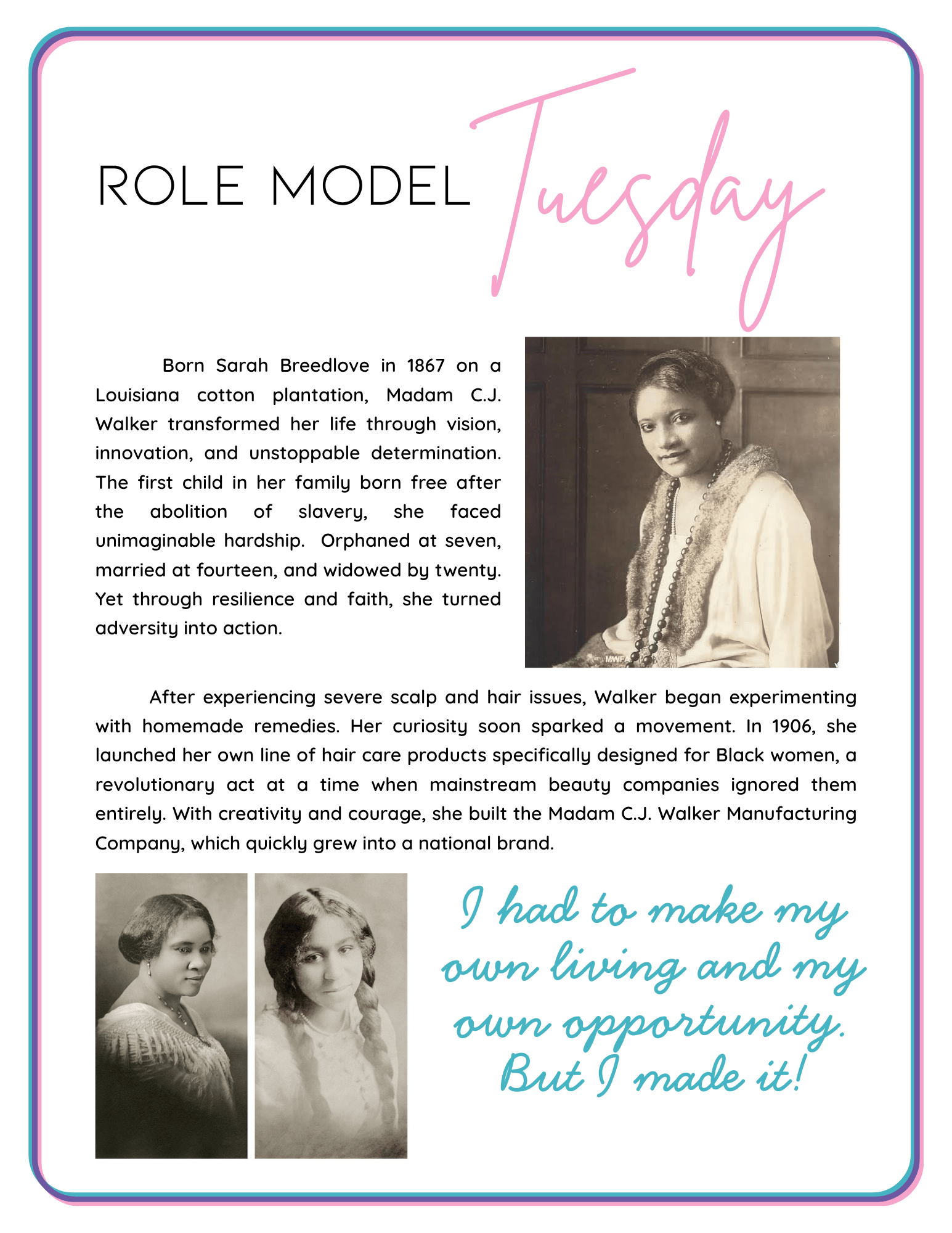 This week, we’re celebrating the unstoppable spirit of Madam C.J. Walker. An innovator, entrepreneur, and philanthropist who turned adversity into opportunity. From humble beginnings, she built a business empire that not only transformed beauty standards but also created jobs and independence for thousands of women. Her legacy reminds us that success isn’t just about climbing higher, it’s about lifting others along the way.