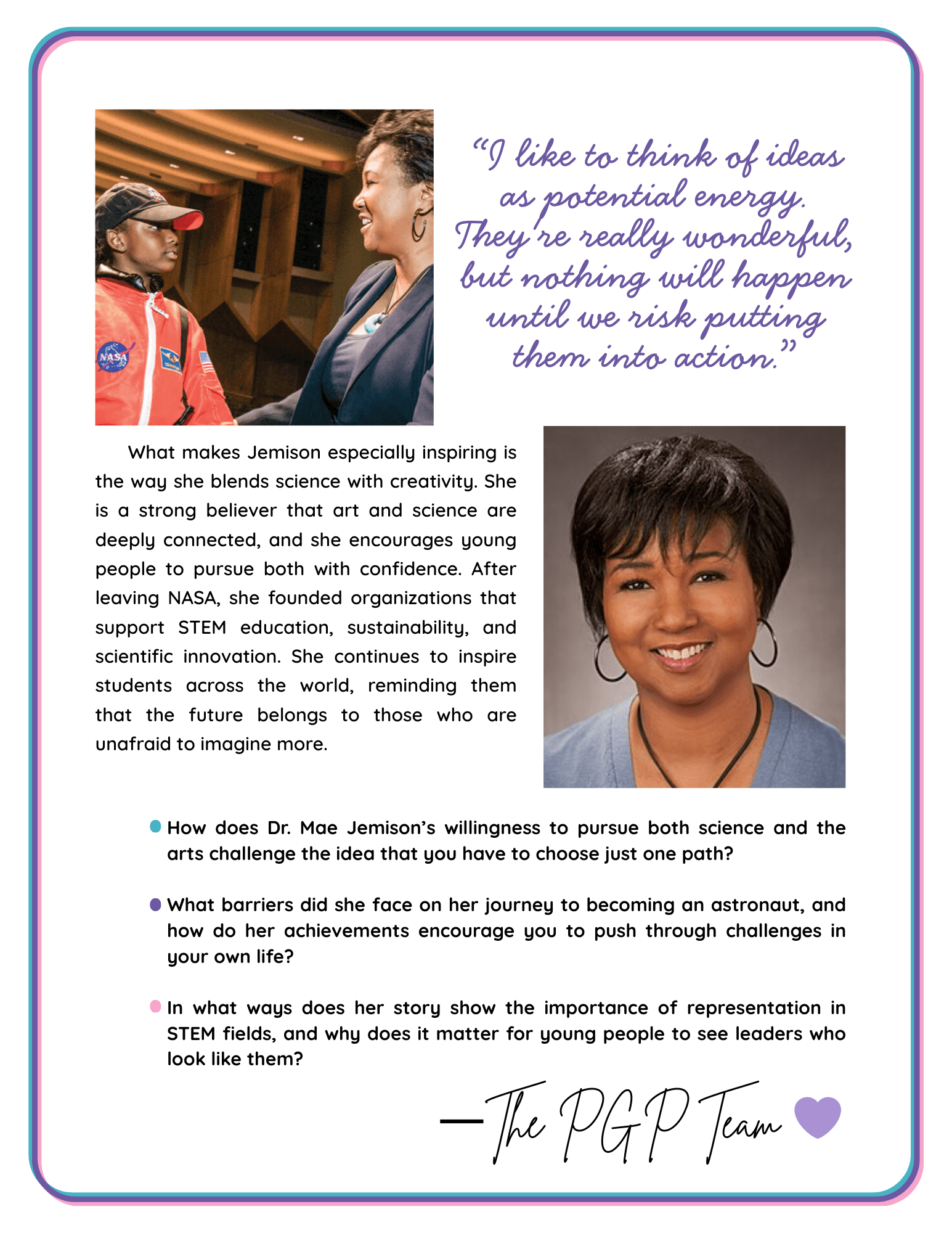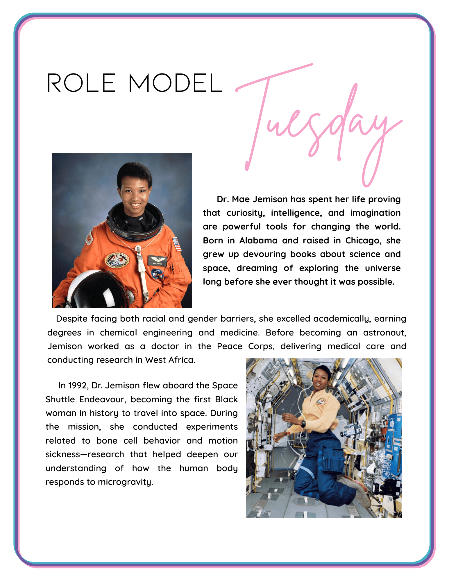 This week we’re celebrating Dr. Mae Jemison, the first Black woman to travel into space and a true champion for imagination, courage, and curiosity. Her work as a physician, engineer, astronaut, and educator shows that exploring our potential is one of the most powerful things we can do. Dr. Jemison’s story reminds us that the future opens widest for those willing to dream boldly and work with purpose.